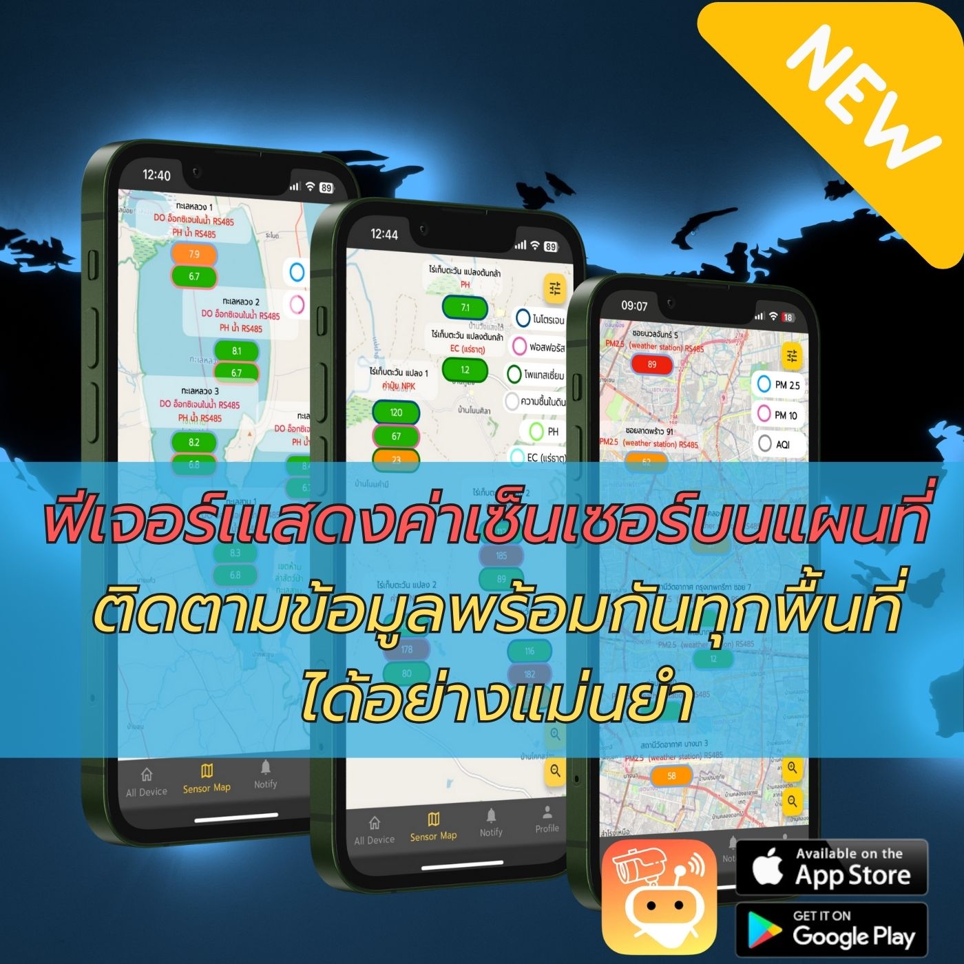 : ฟังชั่น Sensor Map แสดงผลค่า Sensor บนแผนที่และจุดสีตามย่านค่าสูง-กลาง-ต่ำ