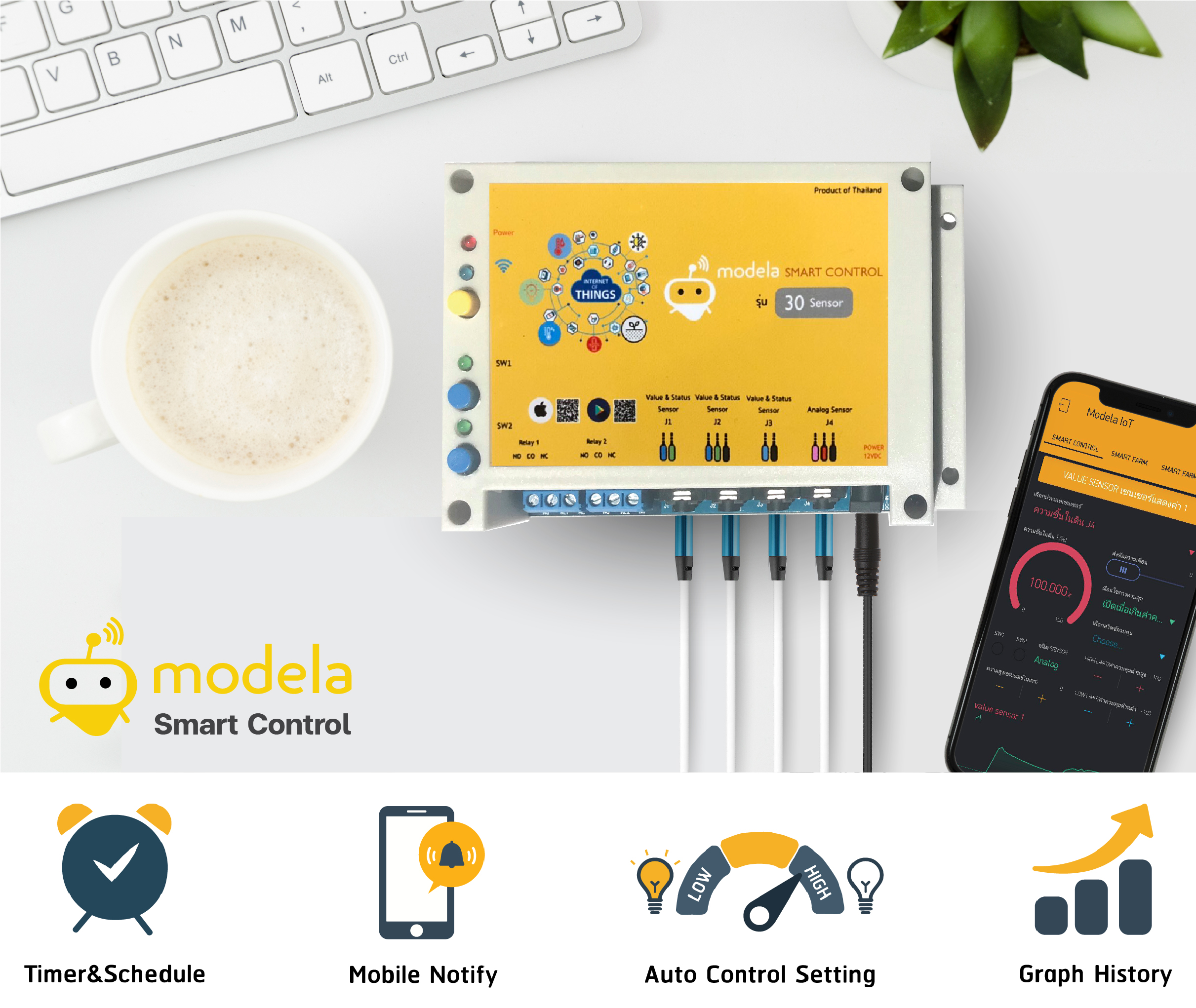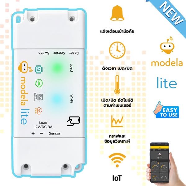 สินค้าไฮเทคนี้ ออกแบบและประกอบในประเทศไทย สำหรับควบคุมอุปกรณ์ไฟฟ้าโดยการวัดค่าเซนเซอร์: ใช้งานผ่านแอพ Modela AIoT Device ได้ทั้ง iOS และ Android