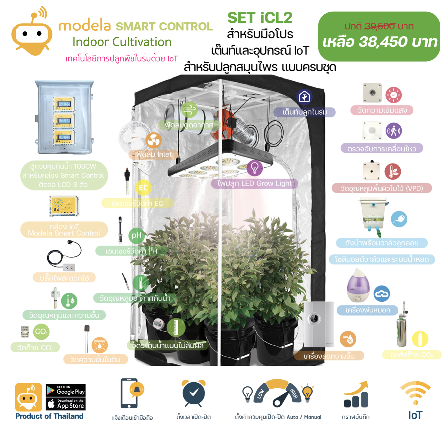 SET iCL2 แพคเกจมืออาชีพ (Pro ) รวมอุปกรณ์เต็นท์ปลูกในอาคาร ปลูกได้ 8-16 ต้น 1 กล่องควบคุม IoT Modela Smart Control 3 กล่อง 2 ตู้ควบคุมกันน้ำ 103CW สำหรับกล่อง Smart Control ติดจอ LCD 3 ตัว 3 ปลั๊กไฟสะดวกใช้ 4 ชุด 4 เซนเซอร์วัดอุณหภูมิและความชื้น 5 วัดแสง LUX/PPFD 6 ความชื้นในดิน 7 เซนเซอร์วัดก๊าซ CO2 8 เซนเซอร์วัดระดับน้ำแบบไม่จุ่มน้ำ 9 ตรวจจับบุคคลเคลื่อนไหว/บุกรุก 10 เซนเซอร์วัดอุณหภูมิแบบกันน้ำ 11 โซลินอยด์วาล์วเปิดปิดปุ๋ยน้ำและระบบท่อน้ำหยด 30 หัว 12 ถังใส่ปุ๋ยน้ำพร้อมวาล์วลูกลอยอัตโนมัติ 13 เซนเซอร์ VPD (วัดอุณหภูมิผิวใบไม้) 14 เซนเซอร์วัด PH Industrial Grade คุณภาพสูง/เซนเซอร์วัด EC Industrial Grade จุ่มแช่ได้ 15 พัดลมเป่าอากาศหมุนเวียนแบบหนีบเสา 6 นิ้ว หมุนส่ายได้ 16 เต็นท์ปลูกในร่ม DoubleGrow 120x120x200 ซม ภายในแผ่นสะท้อนแสง มีหน้าต่าง 17 พัดลมดูดอากาศพร้อมท่อ ขนาด 6 นิ้ว พร่อมท่อลม 1.5 ม. 18 ตัวกรองอากาศคาร์บอนขนาด 6 นิ้ว Activated Carbon Filter 19 ไฟปลูก LED Grow Light Full Spectrum 325W T-Bar ใช้ชิป OSRAM + EPISTAR เลือกเปิดปิดบาร์ได้ 20 เครื่องพ่นหมอกเพิ่มความชื้นและเครื่องลดความชื้นและเซนเซอร์วัดระดับน้ำน้อย 21 ถังก๊าซ CO2 ขนาด 2 ลิตรพร้อมเรกูเลเตอร์และโซลินอยด์วาล์ว แบบทำก๊าซได้เองด้วยผง AB